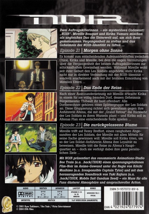 Es kommt zum entscheidenden Aufeinandertreffen zwischen Chloe, Kirika und Mireille, bei dem die vagen Vermutungen über die Vergangenheit der beiden Auftragskillerinnen zur schicksalhaften Gewissheit werden: Während Mireille wohl seit ihrer Geburt den Les Soldats angehörte, steht Kirika nicht nur in direkter Verbindung mit der NOIR-Identität - sondern anscheinend auch mit der brutalen Ermordung von Mireilles Eltern...
