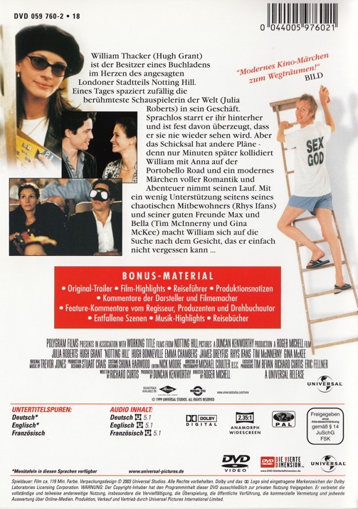William Thacker ist der Besitzer eines Buchladens im Herzen des angesagten Londoner Stadtteils Notting Hill. Eines Tages spaziert zufällig die berühmteste Schauspielerin der Welt in sein Geschäft. Sprachlos starrt er ihr hinterher und ist fest davon überzeugt, dass er sie nie wieder sehen wird. Aber das Schicksal hat andere Pläne - denn nur Minuten später kollidiert William und Anna auf der Portobello Road und ein modernes Märchen voller Romantik und Abenteuer nimmt seinen Lauf. Mit ein wenig Unterstützung seitens seines chaotischen Mitbewohners und seiner guten Freunde Max und Bella macht William sich auf die Suche nach dem Gesicht, das er einfach nicht vergessen kann...