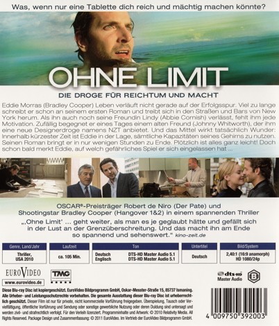 Eddie Morras (Bradley Cooper) Leben verläuft nicht gerade auf der Erfolgsspur. Viel zu lange schreibt er schon an seinem ersten Roman und treibt sich in den Strassen und Bars New Yorks herum. Als ihn auch noch seine Freundin Lindy (Abbie Cornish) verlässt, fehlt ihm jede Motivation. Zufällig begegnet er eines Tages einem alten Freund (Johnny Whitworth), der ihm eine neue Designerdroge namens NZT anbietet. Und das Mittel wirkt tatsächlich Wunder: Innerhalb kürzester Zeit ist Eddie in die Lage, sämtliche Kapazitäten seines Gehirns zu nutzen. Seinen Roman bringt er innerhalb weniger Stunden zu Ende. Plötzlich ist alles ganz leicht! Doch schon bald merkt Eddie, auf welch gefährliches Spiel er sich da eingelassen hat...