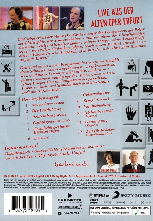 Olaf Schubert ist der Mann fürs Grobe - unter den Feingeistern, der Polier der Philosophie, der Schwerarbeiter - und vor allem der Einzelkämpfer, denn nur wenige Mitstreiter können seinem Tempo, seiner Leidenschaft, seinen wertvollen Gedanken folgen. Nach einem Konzert schrieb er zu deinem Thema in sein Tagebuch: "Ich bin der sich selbst zum Brunnen tragende Eimer."