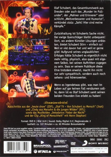Olaf Schubert, das Gesamtkunstwerk aus Dresden oder auch das Wunder im Pullunder, der Mahner und Erinnerer oder schlicht Weltverbesserer und Humorist, verkündet stolz: Seht! Hier sind meine Kämpfe. Zurückhaltung ist Schuberts Sache nicht. Der ewige Querschläger bleibt unbequem! Dort, wo andere Künstler Lösungen anbieten, bietet Schuber Stirn - einfach so! Weil er viel davon hat und weil er gerne gibt! Aufgrund seines unglaublichen Erfolges hätte Schubert es eigentlich nicht mehr nötig, physisch, also quasi mit eigenem Selbst, bei seinen Auftritten zugegen zu sein. Dass er seinem Publikum diese Ehre trotzdem erweist, macht ihn nicht nur sehr sympathisch, sondern auch noch sehens- und hörenswerter. Wenn es irgendetwas gibt, was man im Leben auf gar keinen Fall versäumen sollte, dann ist es Olaf Schubert samt seinen beiden Freunden live erlebt zu haben!