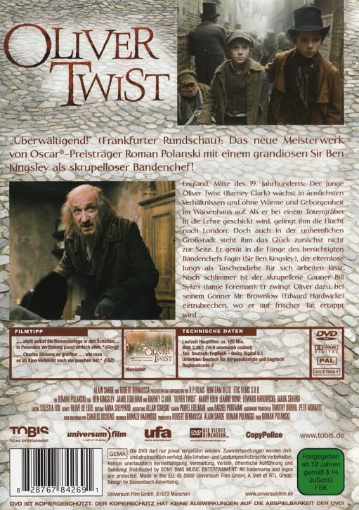England, Mitte des 19.Jahrhunderts: Der junge Oliver Twist wächst in ärmlichen Verhältnissen und ohne Wärme und Geborgenheit im Waisenhaus auf. Als er bei einem Totengräber in die Lehre geschickt wird, gelingt ihm die Flucht nach London. Doch auch hier, in der unheimlichen Grosssstadt, steht ihm das Glück zunächst nicht zur Seite. Er gerät in die Fänge des berüchtigten Bandenchefs Fagin, der elternlose Jungs als Taschendiebe für sich arbeiten lässt. Noch schlimmer ist der skrupellose Gauner Bill Sykes: Er zwingt Oliver dazu, bei seinem Gönner Mr. Brownlow einzubrechen, wo er auf frischer Tat ertappt wird...