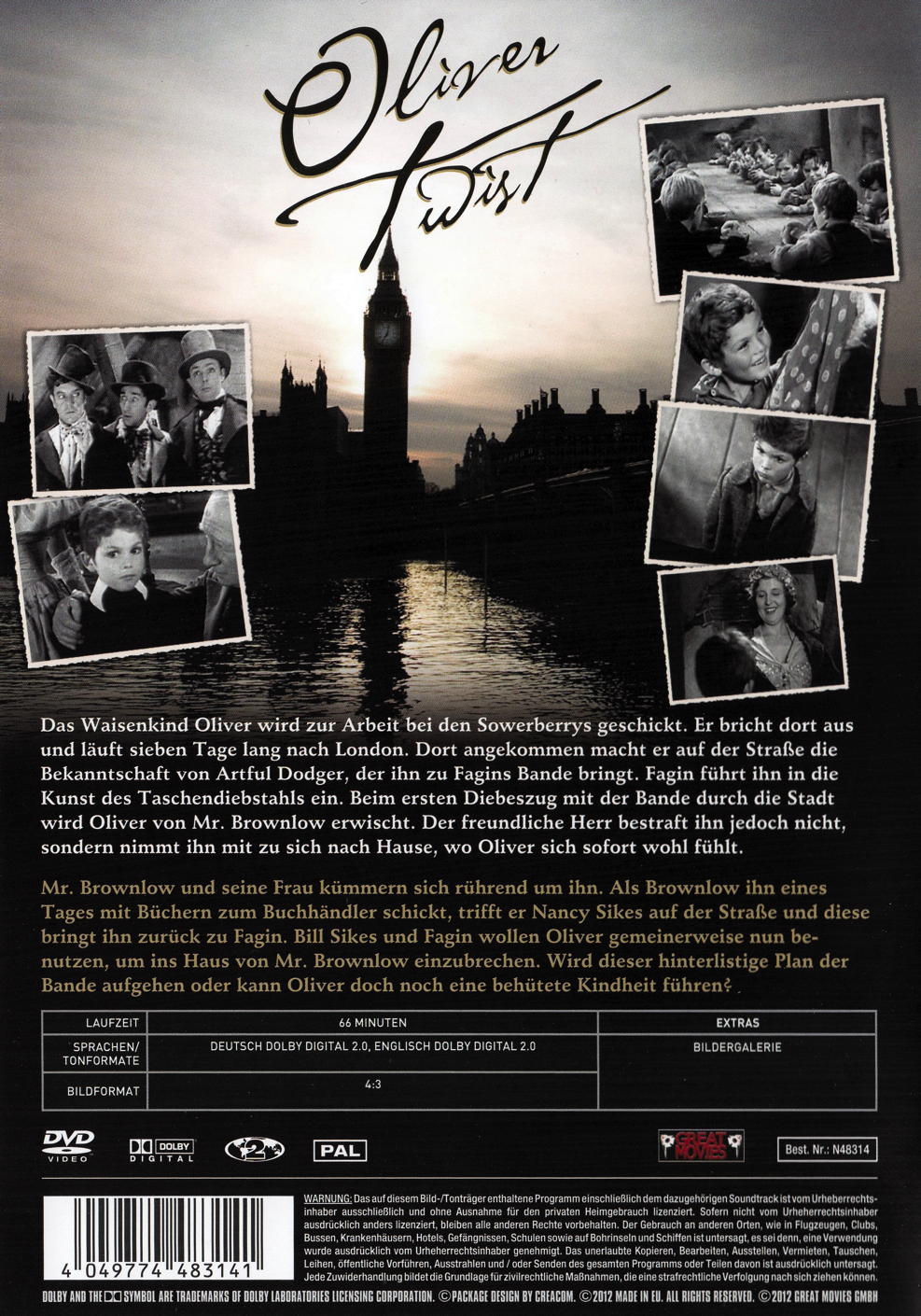 Oliver liegt in der Wiege und die Mutter lässt sich das Baby ein letztes Mal in den Arm legen und stirbt. Nach dem Tod der Mutter wird Oliver in ein Waisenhaus gebracht. Jahre später wird Oliver zur Arbeit bei den Sowerberrys geschickt. Er bricht dort aus und läuft sieben Tage lang nach London. Dort macht er auf der Strasse die Bekanntschaft von The Artful Dodger, der ihn zu Fagins Bande bringt. Der Junge fühlt sich schnell heimisch. Zum ersten Mal kümmern sich Menschen um ihn. Fagin führt ihn in die Kunst des Taschendiebstahls ein. Für Oliver ist es ein lustiges Spiel. Beim ersten Diebstahlszug mit der Bande durch die Stadt wird Oliver von Mr Brownlow erwischt. Der nette Herr nimmt ihn jedoch mit zu sich nach Haus. Mr Brownlow und seine Nichte Rose Maylie kümmern sich rührend um ihn. Als Brownlow Oliver vertrauensvoll mit Büchern und viel Geld zum Buchhändler schickt, trifft Nancy Sikes ihn auf der Strasse und bringt ihn zurück zu Fagin. Bill Sikes und Fagin benutzen Oliver nun, um ins Haus von Mr Brownlow einzubrechen. Beim Einbruch wird Oliver angeschossen und bleibt zurück bei Brownlow und Rose. Sikes und Fagin planen nun, Oliver umzubringen. Nancy verrät dies Rose und Mr Brownlow, wird jedoch von Artful Dodger belauscht, der dies Fagin verrät. Sikes erschlägt daraufhin Nancy und wird nun als Mörder gesucht. In Fagins Unterschlupf wird er aufgespürt und erhängt sich aus Angst vor dem Mob. Die Bande landet im Gefängnis. Oliver besucht dort Fagin ein letztes Mal kurz vor dessen Hinrichtung.