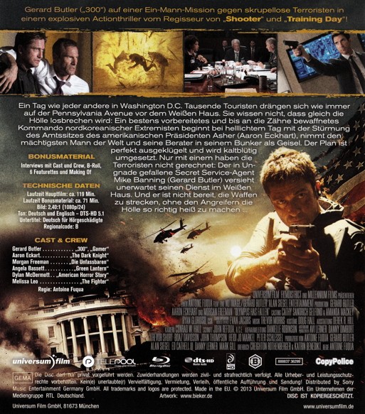 Mike Banning (Gerard Butler) ist einer der besten Agenten des amerikanischen Secret Service. Als er eines Abends zusammen mit dem Präsidenten Benjamin Asher (Aaron Eckhart) und der First Lady Margaret (Asley Judd) in einem Auto unterwegs ist, kommt es zu einem tragischen Unfall. Banning muss blitzschnell handeln: Er entscheidet sich für die Rettung des Präsidenten und opfert somit dessen Frau. Obwohl ihm von allen Seiten bestätigt wird, die richtige Entscheidung getroffen zu haben, fällt er in Ungnade und bekommt einen Posten hinter dem Schreibtisch verpasst. Als die USA sich eines Tages ganz plötzlich von einer Gruppe nordkoreanischer Terroristen überrannt sieht, denen es in all dem Chaos gelingt, den Präsidenten in ihre Gewalt zu bringen, sieht Banning die Chance gekommen, seinen Fehler von einst wieder auszubügeln und das Land mit seinem heldenhaften Einsatz vor der Zerstörung zu retten.