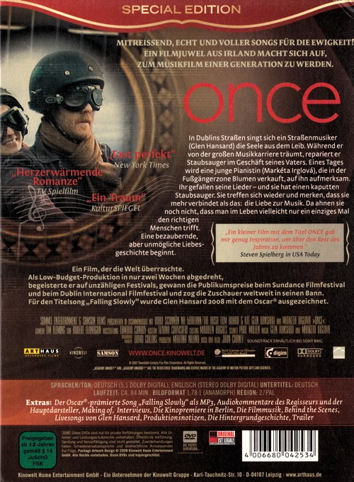 In Dublins Strassen singt sich ein Strassenmusiker (Glen Hansard) die Seele aus dem Leib. Während er von der grossen Musikkarriere träumt, repariert er Staubsauger im Geschäft seines Vaters. Eines Tages wird eine junge Pianistin (Markéta Irglová), die in der Fussgängerzone Blumen verkauft, auf ihn aufmerksam. Ihr gefallen seine Lieder - und sie hat einen kaputten Staubsauger. Sie treffen sich wieder und merken, dass sie mehr verbindet als das: die Liebe zur Musik. Da ahnen sie noch nicht, dass man im Leben vielleicht nur ein einziges Mal den richtigen Menschen trifft. Eine bezaubernde, aber unmögliche Liebesgeschichte beginnt.