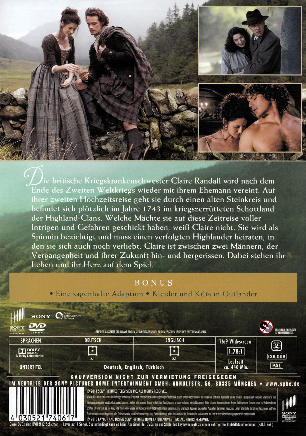 Die britische Kriegskrankenschwester Claire Randall (Caitriona Balfe) wird nach dem Ende des Zweiten Weltkriegs wieder mit ihrem Ehemann vereint. Auf ihrer zweiten Hochzeitsreise geht sie durch einen alten Steinkreis und befindet sich plötzlich im Jahre 1743 im kriegszerrütteten Schottland der Highland-Clans. Welche Mächte sie auf diese Zeitreise voller Intrigen und Gefahren geschickt haben, weiss Claire nicht. Sie wird als Spionin bezichtigt und muss einen verfolgten Highlander heiraten, in den sie sich auch noch verliebt. Claire ist zwischen zwei Männern, der Vergangenheit und ihrer Zukunft hin- und hergerissen. Dabei stehen ihr Leben und ihr Herz auf dem Spiel...