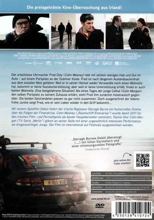 Der arbeitslose Uhrmacher Fred Daly (Colm Meaney) lebt mit seinem wenigen Hab und Gut im Auto auf einem Parkplatz an der Dubliner Küste. Fred ist nach längerem Auslandsaufenthalt aus dem sozialen Netz gefallen: Weil er in seiner Heimat weder Verwandte noch einen Wohnsitz hat, bekommt er keine Sozialunterstützung, aber weil er keine Unterstützung erhält, findet er auch keinen Wohnsitz. Eine festgefahrene Situation! Als eines Tages der junge Cathal (Colin Morgan) den selben Parkplatz zu seinem Zuhause erklärt, steht Fred ihm zunächst misstrauisch gegenüber. Die beiden Gestrandeten passen so gar nicht zusammen. Doch ausgerechnet der lebensfrohe Junkie zeigt Fred, wie er sein Leben wieder in den Griff bekommt... Mit seinem Spielfilm-Debüt liefert der irische Zegisseur Darragh Byrne ein humorvolles Drama über die Folgen der Finanzkrise. Colm Meaney (Raumschiff Enterprise ) wurde damit für den irischen Film- und Fernsehpreis als bester Hauptdarsteller nominiert, Teenie-Star Colin Morgan (TV-Serie Merlin ) glänzt an seiner Seite mit einer ungewöhnlich intensiven Performance als drogensüchtiger Junge. Der Film ist international auf Festivals ausgezeichnet worden.