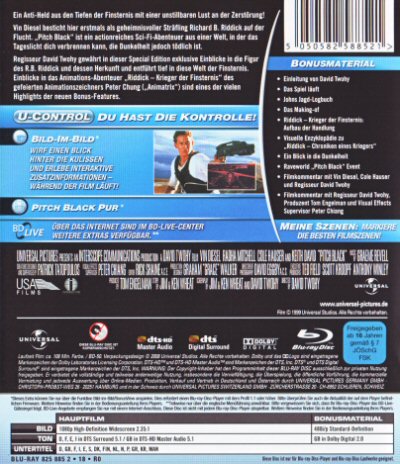 Vin Diesel besticht hier erstmals als geheimnisvoller Sträfling Richard B. Riddick auf der Flucht. "Pitch Black" ist ein actionreiches Sci-Fi-Abenteuer aus einer Welt, in der das Tageslicht dich verbrennen kann, die Dunkelheit jedoch tödlich ist.