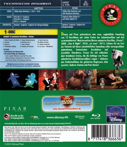 Endlich gibt es eine zweite Sammlung der bis jetzt erschienenen Kurzfilme der kreativen Köpfe von Pixar. Sie knüpft mit "Dein Freund, die Ratte" nahtlos an die erste Sammlung an. Mit bahnbrechender Animation bieten "La Luna - Mondlicht", "Teilweise wolkig", "Burn-E" und viele weitere Kurzfilme jede Menge Unterhaltung.