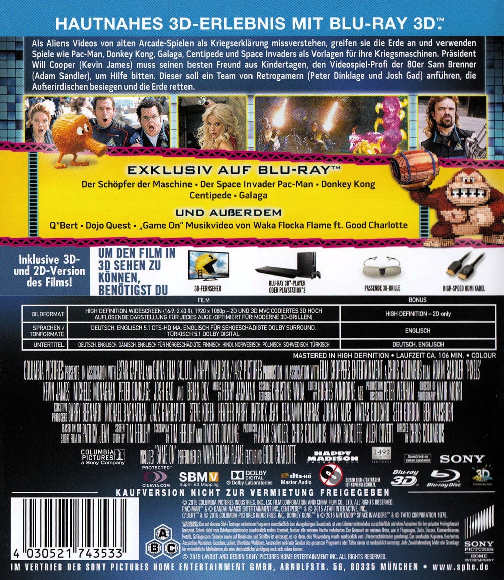 Peter Dinklage, Michelle Monaghan, Josh Gad, Kevin James, Rob Archer, Timothy Dowling, Christine Wada, Chris Columbus, Peter Wenham, Amir Mokri...Angela Demo, Patrick Jean, Hughes Winborne, Barry Bernardi, John Buchan, Allen Covert, Tim Herlihy, Jason Knight, Mark Radcliffe, Michael Barnathan, Jack Giarraputo, Adam Sandler, Barbara J. McCarthy, Heather Parry, Mathias Boucard, Benjamin Darras, Benjamin Waisbren, Johnny Alves, Steven Wayne Koren