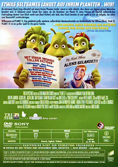 Als Astronaut Chuck (Ingo Albrecht) auf einem fernen Planeten landet, staunt er nicht schlecht, dass dieser von kleinen grünen Männchen bewohnt wird. Er bekommt einen Schock fürs Leben, als die Bewohner von Planet 51 seine Präsenz als Überfall ausserirdischer Eindringlinge deuten! Zum Glück merkt Lem (Raul Richter) sehr bald, dass Chuck harmlos ist und macht es sich zur Aufgabe, ihn sicher zum Raumschiff zurückzubringen.
