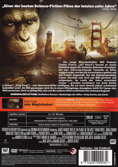 Will Rodman (James Franco) ist ein junger, engagierter Wissenschaftler, der zusammen mit seinem Vater (John Lithgow), ebenfalls ein Forscher, Heilmittel für Menschen erforscht. Ein vielversprechendes Mittel, in das Will viele Hoffnungen setzt, testet er in einem hoch-modernen Labor an Affen. Ein besonderer Affe namens Caesar (Andy Serkis) wächst ihm dabei ans Herz. Das Mittel scheint zu funktionieren. Doch plötzlich ruft es noch ganz andere, unerwartete Reaktionen hervor…