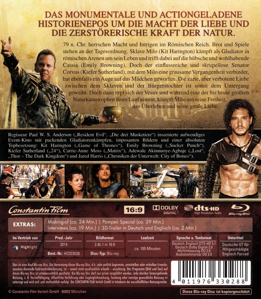 79 n. Chr. herrschen Macht und Intrigen im römischen Reich. Brot und Spiele stehen an der Tagesordnung. Sklave Milo (Kit Harington) kämpft als Gladiator in römischen Arenen um sein Leben und trifft dabei auf die hübsche und wohlhabende Cassia (Emily Browning). Doch der einflussreiche und skrupellose Senator Corvus (Kiefer Sutherland), mit dem Milo eine grausame Vergangenheit verbindet, hat ebenfalls ein Auge auf das Mädchen geworfen. Die zarte aber verbotene Liebe zwischen dem Sklaven und der Bürgerstochter ist somit dem Untergang geweiht. Doch dann regt sich der Vesuv und während eine der bis heute größten Naturkatastrophen ihren Lauf nimmt, kämpft Milo um seine Freiheit, das Überleben und seine große Liebe.