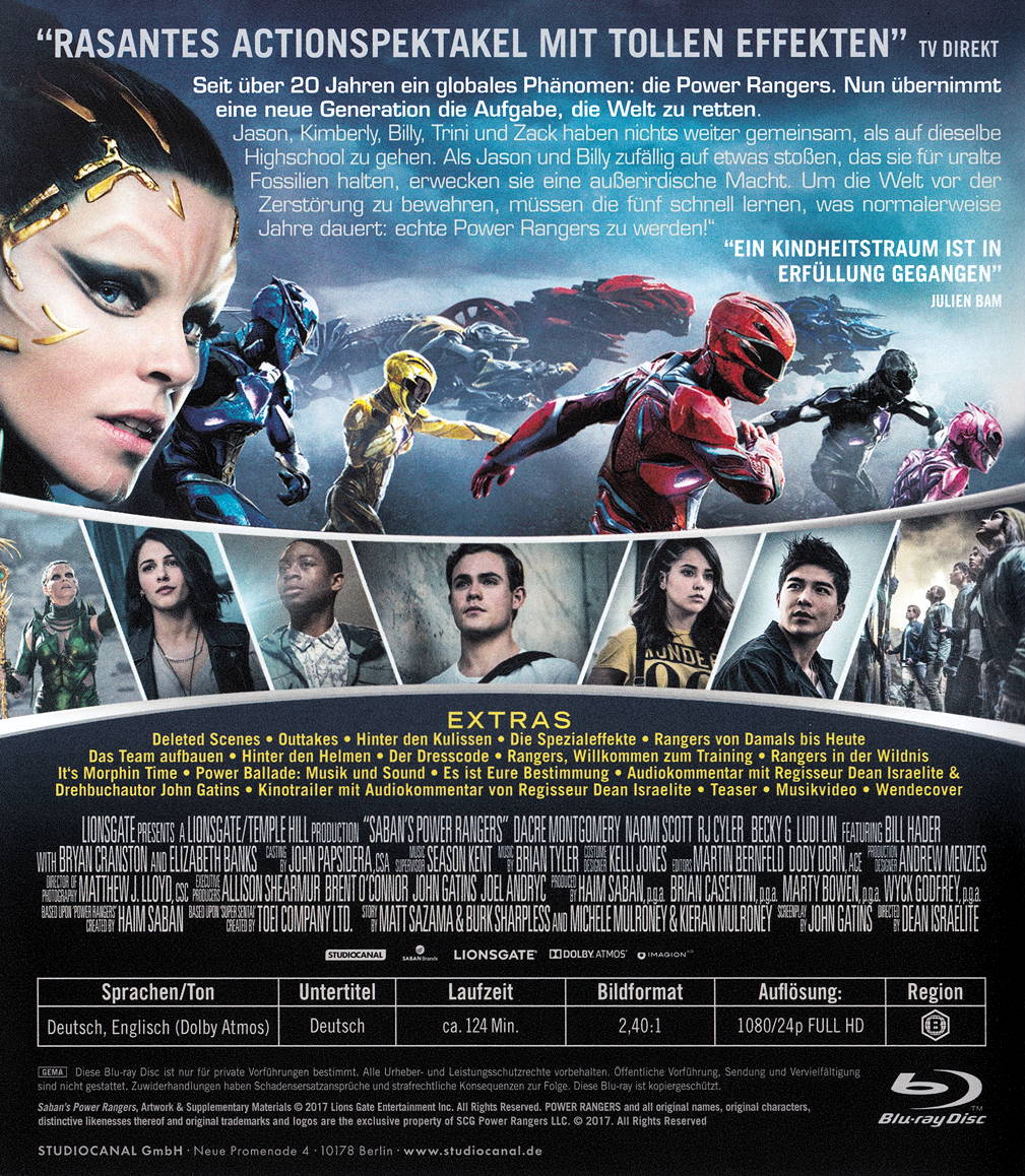 Sie sind seit über 20 Jahren ein globales Phänomen: die Power Rangers. Millionen Fans lieben ihre Abenteuer. Jetzt übernimmt eine neue Generation junger Helden die Aufgabe, die Welt vor der Zerstörung durch Ausserirdische zu bewahren. Für den neuen Power-Rangers-Reboot ist ein Ensemble angesagter Nachwuchsdarsteller wie Naomi Scott als Pink Ranger, RJ Cyler als Blue Ranger, Becky G als Yellow Ranger und Hollywood-Stars wie Elizabeth Banks als Rita Repulsa zusammengekommen.