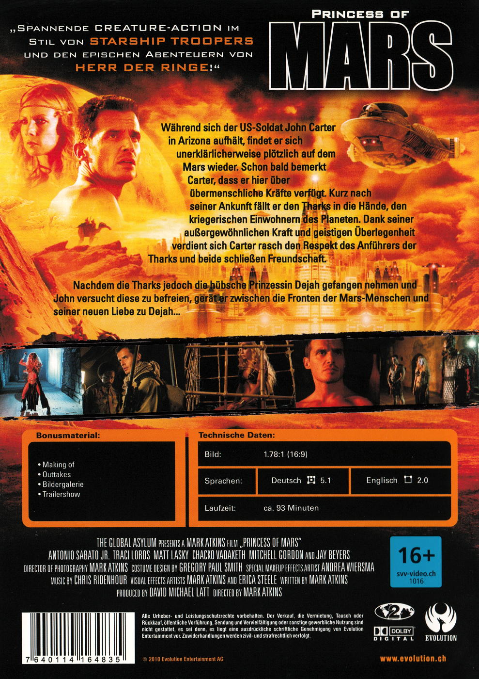 Während sich der US-Soldat John Carter in Arizona aufhält, findet er sich unerklärlicherweise plötzlich auf dem Mars wieder. Schon bald bemerkt Carter, dass er hier über übermenschliche Kräfte verfügt. Kurz nach seiner Ankunft fällt er den Tharks in die Hände. Diese grünen, vierarmigen Wesen sind ein nomadischer Kriegerstamm und Einwohner des Planeten Mars. Dank seiner außergewöhnlichen Kraft und geistigen Überlegenheit verdient er sich rasch den Respekt dieses Volkes und sichert sich eine gute Position im Stamm. Tars Tarkas, einer der Anführer der Tharks, und John schließen Freundschaft. Später nehmen die Tharks die Prinzessin von Helium Dejah Thoris gefangen. Sie gehört der humanoiden Marsrasse des Planeten an. Diese Mars-Menschen bewohnen ein loses Netz von Stadtstaaten und kontrollieren die für die Landwirtschaft so wichtigen Wasserkanäle des Wüstenplanets. Carter rettet die Prinzessin aus der Gewalt der Tharks, um sie zu ihren Leute zurückzubringen. Zum Dank öffnet ihm die Prinzessin ihr Herz und die beiden werden ein Paar. Carter gerät, während er zu vermitteln versucht, mehr und mehr zwischen die Fronten der Tharks und der Mars-Menschen. Während einer kriegerischen Auseinandersetzung opfert Carter scheinbar sein eigenes Leben. Jedoch erwacht er kurz darauf zurück auf der Erde, sich fragend, was aus seiner Prinzessin geworden ist und ob er je zurückkehren kann...