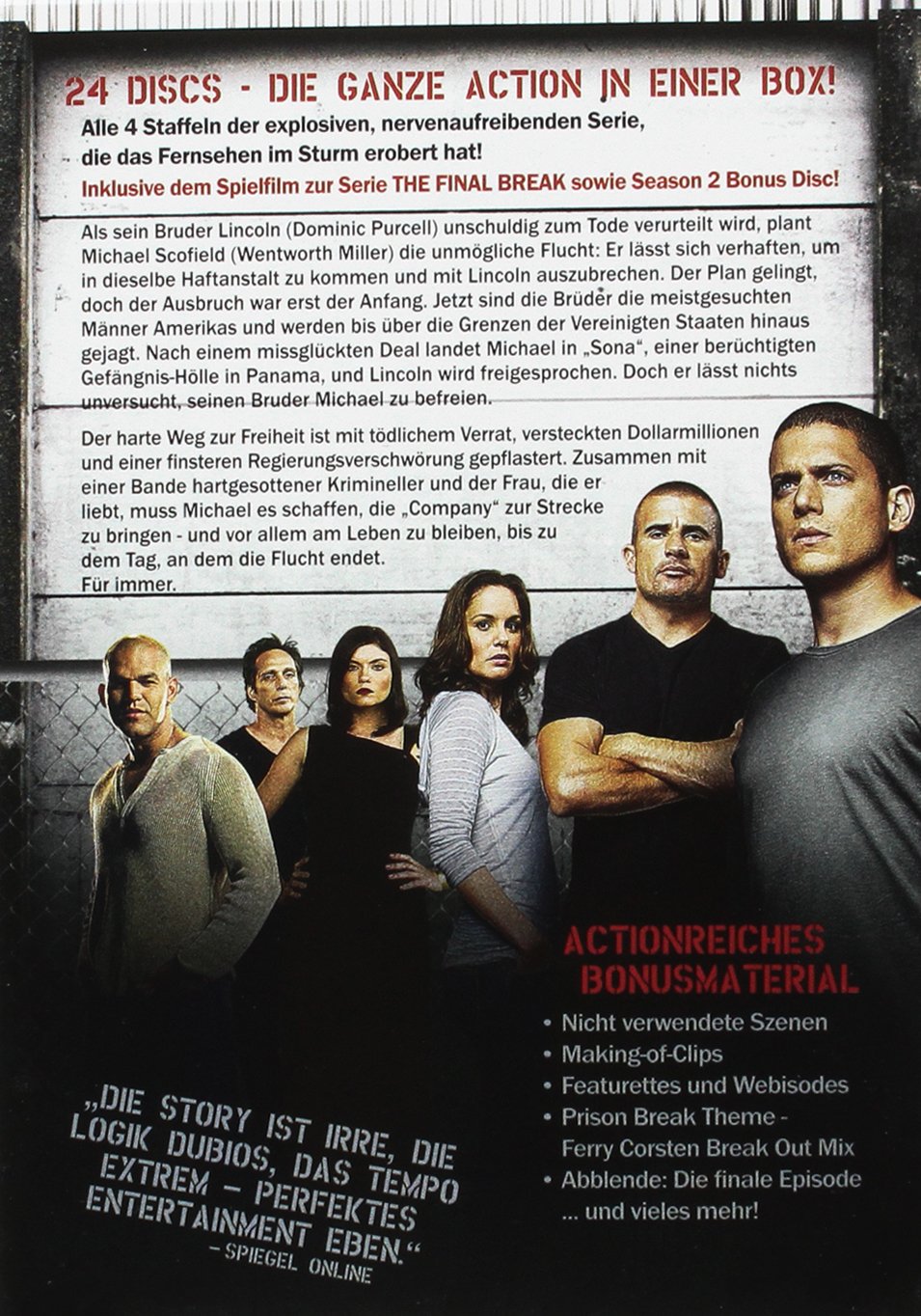 Als sein Bruder Lincoln (Dominic Purcell) unschuldig zum Tode verurteilt wird, plant Michael Scofield (Wentworth Miller) die unmögliche Flucht. Er lässt sich verhaften, um in dieselbe Haftanstalt zu kommen und mit Lincoln auszubrechen. Der Plan gelingt, doch der Ausbruch war erst der Anfang. Jetzt sind die Brüder die meistgesuchten Männer Amerikas und werden bis über die Grenzen der Vereinigten Staaten hinaus gejagt. Nach einem missglückten Deal landet Michael in „Sona“, einer berüchtigten Gefängnis-Hölle in Panama, und Lincoln wird freigesprochen. Doch er lässt nichts unversucht, seinen Bruder Michael zu befreien. Der harte Weg zur Freiheit ist mit tödlichem Verrat, versteckten Dollarmillionen und einer finsteren Regierungsverschwörung gepflastert. Michael – zusammen mit der Frau, die er liebt, und einer Bande hartgesottener Krimineller – muss es schaffen, die „Company“ zur Strecke zu bringen und vor allem am Leben zu bleiben, bis zu dem Tag, an dem die Flucht endet – für immer. Inhalt der Bonus-Disc