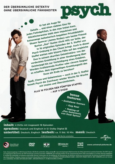 Er hat ein Auge für Details... und einen siebten Sinn für jedes Fettnäpfchen, in das man treten kann. Glücklicherweise steht dem impulsiven und keineswegs hellseherisch begabten Privatdetektiv Shawn Spencer sein bester Freund Burton "Gus" Guster zur Seite, der in 16 originellen Episoden der 5. Staffel von Psych Ordnung in das Chaos bringt. Auch in dieser Staffel warten sehr bizarre Fälle auf das ungleiche Duo in seinem skurrilen Detektivbüro: von der verdeckten Ermittlung in einer Straßengang über Geisterjagd bis zur Verteidigung eines Eisbären. Werden rivalisierende Profiler oder clevere Gegner es schaffen, dem eigenwilligen Ermittlungsstil des Duos ein Ende zu bereiten? Spaß, Chaos und Geheimnisse - auch in der 5. Staffel fesselt Psych die Zuschauer wieder Woche für Woche mit Unsinn und Übersinnlichem.