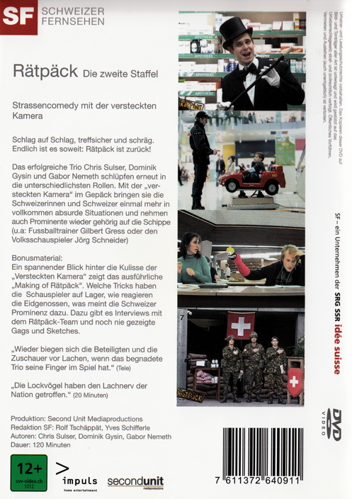 Endlich ist es soweit: Rätpäck ist zurück! Das erfolgreiche Trio Chris Sulser, Dominik Gysin und Gabor Nemeth schlüpfen erneut in die unterschiedlichsten Rollen. Mit der "versteckten Kamera" im Gepäck bringen sie die Schweizerinnen und Schweizer einmal mehr in vollkommen absurde Situationen und nehmen auch Prominente wieder gehörig auf die Schippe (u.a: Fussballtrainer Gilbert Gress oder den Volksschauspieler Jörg Schneider)