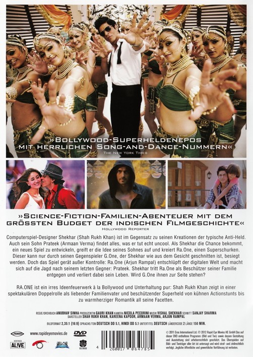 Ra.One ist ein irres Ideenfeuerwerk à la Bollywood und Unterhaltung pur: Shah Rukh Khan zeigt in einer spektakulären Doppelrolle als liebender Familienvater und beschützender Superheld von kühnen Actionstunts bis zu warmherziger Romantik all seine Facetten.