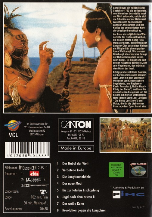 Repa Nui, Nabel der Welt, nennen die Eingeborenen ihre Heimat, die Osterinsel. Schon lange bevor 1722 die entlegenste von Menschen bewohnte Insel der Welt entdeckt wurde, spitzte sich die Situation auf der Osterinsel zwischen den herrschenden Langohren und den unterdrückten Kurzohren dramatisch zu. Zur Feier der alljährlichen Wiederkehr der Russseeschwalben bestimmt jeder Langohr-Clan aus seinen Reihen ein Mitglied für einen gnadenlosen Wettkampf. Wer seinem Oberhaupt als erster das Gelege der Russseeschwalbe unversehrt bringt, ist Sieger und kürt seinen Häuptling damit ein Jahr zum Vogelmann, dem mächtigsten Mann der Insel.