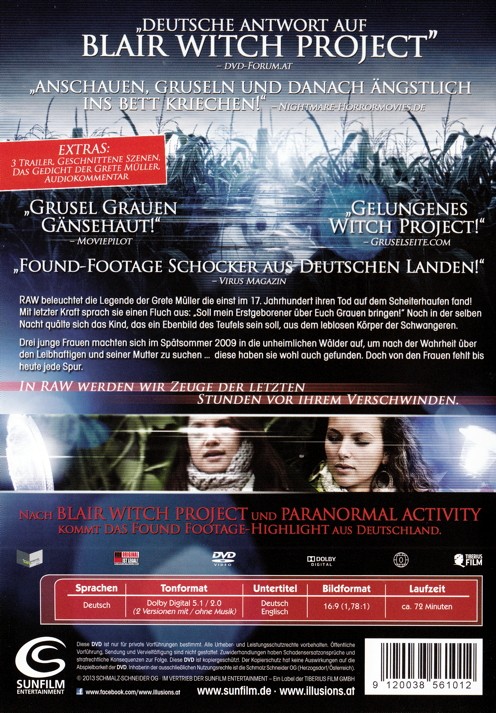 RAW beleuchtet die Legende der Grete Müller, die einst im 17. Jahrhundert ihren Tod auf dem Scheiterhaufen fand! Mit letzter Kraft sprach sie einen Fluch aus: ''Soll mein Erstgeborener über Euch Grauen bringen!'' Noch in derselben Nacht quälte sich das Kind, das ein Ebenbild des Teufels sein soll, aus dem leblosen Körper der Schwangeren. Drei junge Frauen machten sich im Spätsommer 2009 auf in die unheimlichen Wälder der Legende, um nach der Wahrheit über den Leibhaftigen und seiner Mutter zu suchen...diese haben sie wohl auch gefunden. Doch von den Frauen fehlt bis heute jede Spur. In RAW werden wir Zeuge ihrer letzten Stunden vor ihrem Verschwinden... Nach Blair Witch Project und Paranormal Activity kommt das Found Footage-Highlight aus Deutschland Erstauflage in roter Hülle