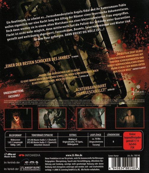Ein Routinejob, so scheint es.... Fernsehmoderatorin Angela Vidal und ihr Kameramann Pablo wollen eigentlich nur eine Nacht lang den Alltag der Männer einer Feuerwache dokumentieren. Doch dann werden sie dort von einer blutverschmierten Frau angegriffen. Flucht ist nicht mehr möglich, denn mittlerweile hat die Polizei das Gebäude unter Quarantäne gestellt und weiträumig abgesperrt. Fernsehteam, Beamte, Feuerwehrmänner und Mieter sind gefangen in dem Haus. Dann bricht die Hölle los...!