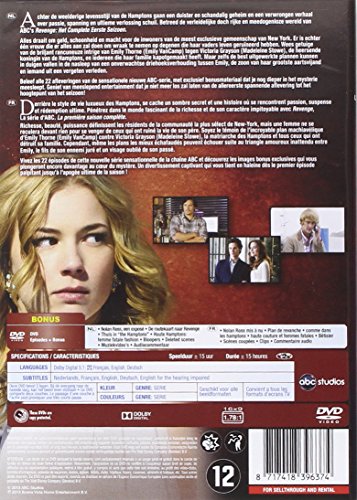 Import Hollandais avec langue Francais, Anglais, Allemand sous-titres Francais, Anglais, Allemagne Derrière le style de vie luxueux des Hamptons, se cache un sombre secret et une histoire où se rencontrent passion, suspense et rédemption ultime. Pénétrez dans le monde fascinant de la richesse et de son caractère impitoyable avec Revenge, la série d'ABC. La première saison complète. Richesse, beauté, puissance définissent les résidents de la communauté la plus select de New York, mais une femme ne reculera devant rien pour se venger de ceux qui ont ruiné la vie de son père. Soyez le témoin de l'incroyable plan machiavélique d'Emily Thorne (Emily VanCamp) contre Victoria Grayson (Madeleine Stowe), la matriarche des Hamptons et tous ceux qui ont détruit sa famille. Cependant, même les plans les mieux échafaudés peuvent échouer suite au triangle amoureux inattendu entre Emily, le fils de son ennemi juré et un visage oublié de son passé. Vivez les 22 épisodes de cette nouvelle série sensationnelle de la chaîne ABC et découvrez les images bonus exclusives qui vous plongeront encore davantage au coeur du mystère. Un divertissement captivant qui vous tient en haleine dès le premier épisode palpitant jusqu'à l'apogée ultime de la saison!