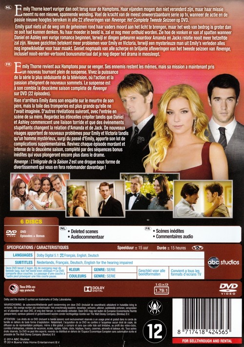 Die rachsüchtige Emily Thorne kehrt zurück in die Hamptons. Ihre Feinde sind wohl die gleichen, aber ihre raffi nierten Pläne zeigen neue, spannende Wendungen. Lassen Sie sich verführen von Revenge - Die komplette zweite Staffel mit 22 Episoden voller Leidenschaft und Vergeltung. Emily lässt sich von nichts aufhalten, um die Geheimnisse über den Mord ihres Vaters zu lüften. Doch das Netz der Betrüger ist größer, als sie es sich je vorgestellt hätte. Nachdem sie ihrer Mutter die ganze Wahrheit erzählt hat, kommen nur noch mehr Intrigen zum Vorschein. Während Daniel und Ashley ein glühendes Liebesabenteuer beginnen, verändert sich die Beziehung von Amanda und Jack durch verblüffende Ereignisse. Doch dadurch entstehen nur noch mehr Probleme für Emily und Victoria, die durch einen mysteriösen Mann aus Emilys Vergangenheit verstärkt werden. Verpassen Sie auf keinen Fall die bissigen und brillanten Momente mit exklusivem Bonusmaterial, das noch tiefere Einblicke in das Drama erlaubt.