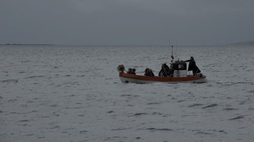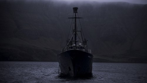 Eine Gruppe von Touristen trifft sich auf einem ehemaligen Walfängerschiff zum Whale-Watching in Island.