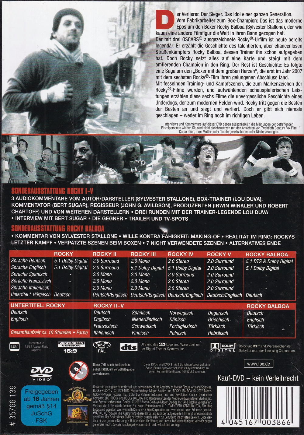 Sammlung mit den fünf von 1976 bis 1990 entstandenen Filmen, in denen Sylvester Stallone den boxenden Underdog Rocky Balboa verkörpert und den amerikanischen Mythos der Möglichkeit des Aufstiegs eines Niemands zum Superstar auf der Leinwand zelebriert. Die auf Drehbüchern von Stallone beruhenden Filme wurden teils von ihm selbst inszeniert (II, III, IV), teils von John G. Avildsen (I, V). "Rocky I" wurde mit drei Oscars ausgezeichnet, u.a. als bester Film und für die beste Regie.