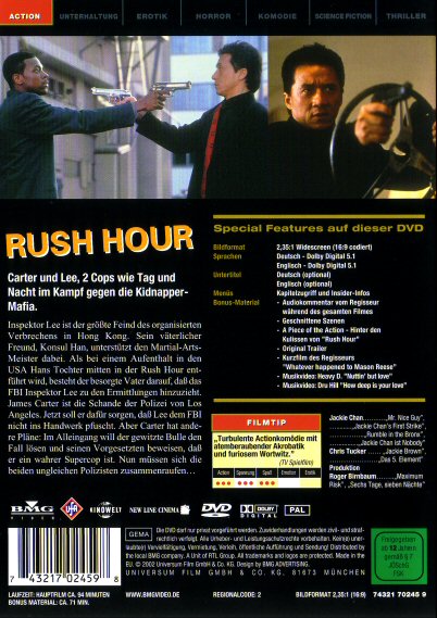 Inspektor Lee ist der grösste Feind des organisierten Verbrechens in Hongkong. Sein väterlicher Freund, Konsul Han, unterstützt den Martial-Arts-Meister dabei. Als bei einem Aufenthalt in den USA Hans Tochter mitten in der Rush Hour entführt wird, besteht der besorgte Vater darauf, dass das FBI Inspektor Lee zu den Ermittlungen hinzuzieht. James Carter ist die Schande der Polizei von Los Angeles. Jetzt soll er dafür sorgen, dass Lee dem FBI nicht ins Handwerk pfuscht. Aber Carter hat andere Pläne: Im Alleingang will der gewitzte Bulle den Fall lösen und seinen Vorgesetzten beweisen, dass er ein wahrer Supercop ist. Nun müssen sich die beiden ungleichen Polizisten zusammenraufen...