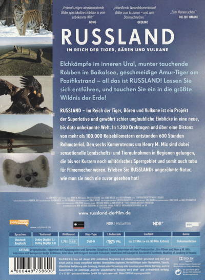 RUSSLAND - Im Reich der Tiger, Bären und Vulkane ist ein Projekt der Superlative und gewährt schier unglaubliche Einblicke in eine neue, bis dato unbekannte Welt. In 1.200 Drehtagen und über eine Distanz von mehr als 100.000 Reisekilometern entstanden 600 Stunden Rohmaterial. Den sechs Kamerateams um Henry M. Mix sind dabei sensationelle Landschafts- und Tieraufnahmen in Regionen gelungen, die bis vor Kurzem noch militärisches Sperrgebiet und somit auch tabu für Filmemacher waren. Erleben Sie Russlands ungezähmte Natur, wie man sie noch nie zuvor gesehen hat!
