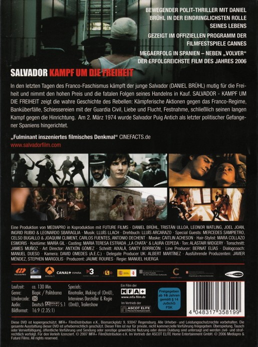 In den letzten Tagen des Franco-Faschismus kämpft der junge Salvador (Daniel Brühl) mutig für die Freiheit und nimmt den hohen Preis und die fatalen Folgen seines Handelns in Kauf. SALVADOR-KAMPF UM DIE FREIHEIT zeigt die wahre Geschichte des Rebellen: Kämpferische Aktionen gegen das Franco-Regime, Banküberfälle, Schiessereien mit der Guardia Civil, Liebe und Flucht, Festnahme, schliesslich seinen langen Kampf gegen die Hinrichtung. Am 2. März 1974 wurde Salvador Puig Antich als letzter politischer Gefangener Spaniens hingerichtet.