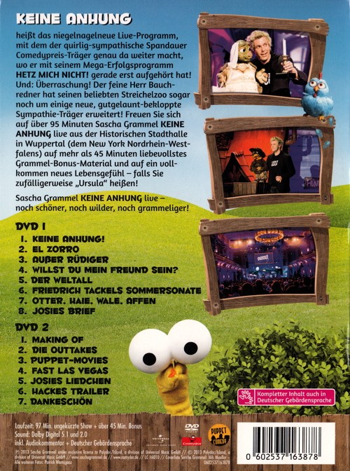 KEINE ANHUNG heisst das niegelnagelneue Live-Programm, mit dem der quirlig-sympathische Spandauer Comedypreis-Träger genau da weiter macht, wo er mit seinem Mega-Erfolgsprogramm HETZ MICH NICHT! gerade erst aufgehört hat! Und: Überraschung! Der feine Herr Bauchredner hat seinen beliebten Streichelzoo sogar noch um einige neue, gutgelaunt-bekloppte Sympathie-Träger erweitert! Freuen Sie sich über 95 Minuten Sascha Grammel KEINE ANHUNG live aus der Historischen Stadthalle in Wuppertal (dem New York Nordrhein-Westfalens) plus mehr als 45 Minuten liebevollstes Grammel-Bonus-Material und auf ein vollkommen neues Lebensgefühl - falls Sie zufälligerweise "Ursula" heissen!