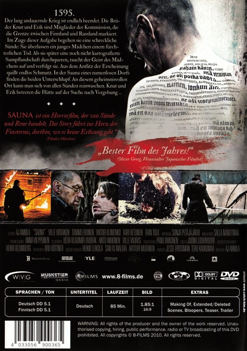 1595: Der lang andauernde Krieg ist endlich beendet. Die Brüder Knut und Erik sind Mitglieder der Kommission, die die Grenze zwischen Finnland und Russland markiert. Im Zuge dieser Aufgabe begehen sie eine schreckliche Sünde: Sie überlassen ein junges Mädchen einem fürchterlichen Tod. Als sie später eine noch nicht kartografierte Sumpflandschaft durchqueren, taucht der Geist des Mädchens auf und verfolgt sie. Aus dem Antlitz der Erscheinung quillt endlos Schmutz. In der Sauna eines namenlosen Dorfs finden die beiden Unterschlupf. In diesem geheimnisvollen Ort kann man sich von allen Sünden reinwaschen. Knut und Erik betreten die Hütte auf der Suche nach Vergebung ...