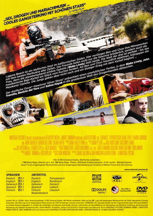 John Travolta, Aaron Johnson, Taylor Kitsch, Blake Lively, Benicio Del Toro, Salma Hayek, Cindy Evans, Tomas Voth, Moritz Borman, Sarah Finn...Todd Arnow, Alexander Doering, Daniel Mindel, Joe Hutshing, Oliver Stone, Stuart Levy, Shane Salerno, Eric Kopeloff, Anja Stadlober, Alex Marquez, Björn Schalla, Fernando Sulichin, Torsten Michaelis, Christin Marquitan, Thomas Danneberg, Ronald Nitschke, Dennis Schmidt-Foss, Tanya Kahana, Tobias Müller