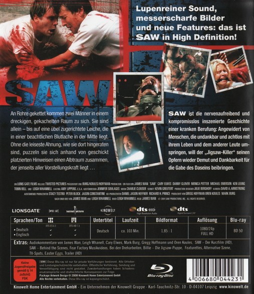 Wessen Blut wird fliessen? An Rohre gekettet kommen zwei Männer in einem dreckigen, gekachelten Raum zu sich. Sie sind allein - bis auf eine übel zugerichtete Leiche, die in einer beachtlichen Blutlache in der Mitte liegt. Ohne die leiseste Ahnung, wie sie dort hingeraten sind, puzzeln sie sich anhand von geschickt platzierten Hinweisen einen Albtraum zusammen, der jenseits jeder Vorstellungskraft liegt...