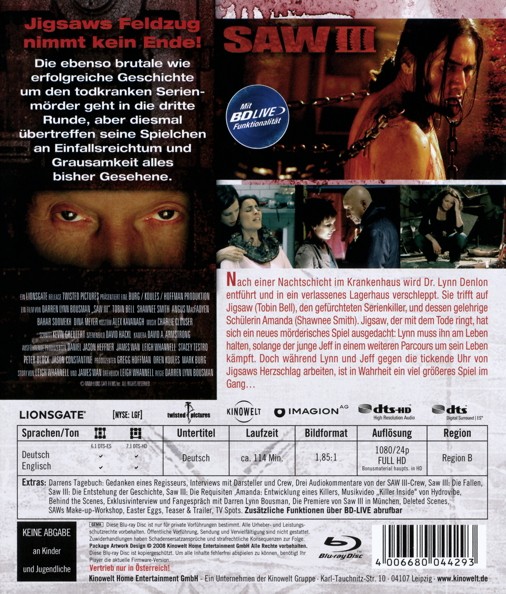 Der Jigsaw Killer lädt zum dritten perversen Spiel auf Leben und vor allem Tod. Während die Polizei weiterhin nach Jigsaw fahndet, hat der dahinsiechende Sadist mit seiner Gefolgsfrau Amanda bereits die nächste Runde seines perversen Spiels eingeläutet: Amanda entführt die Ärztin Dr. Lynn Denlon nach einer ihrer Schichten im Krankenhaus und bringt sie in ein leerstehendes Lagerhaus: Dort soll sie Jigsaw so lange am Leben erhalten, wie sein neues Opfer Jeff braucht, eine Reihe von Aufgaben auf Leben und Tod zu lösen.