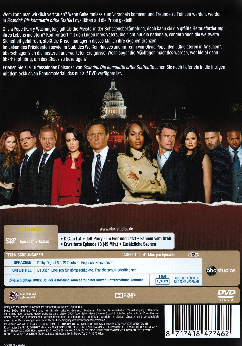 Wem kann man wirklich vertrauen? Wenn Geheimnisse zum Vorschein kommen und Freunde zu Feinden werden, werden in Scandal: Die komplette dritte Staffel Loyalitäten auf die Probe gestellt. Olivia Pope gilt als die Meisterin der Schadensbekämpfung, doch kann sie die grösste Herausforderung ihres Lebens meistern? Konfrontiert mit den Lügen ihres Vaters, die nicht nur die nationale, sondern auch die weltweite Sicherheit gefährden, stösst die Krisenmanagerin dieses Mal an ihre eigenen Grenzen. Im Leben des Präsidenten sowie im Stab des Weissen Hauses und im Team von Olivia Pope, den "Gladiatoren in Anzügen", überschlagen sich die finsteren unerwarteten Ereignisse. Wenn sogar die Mächtigen machtlos werden, wer bleibt dann überhaupt übrig, um das Chaos zu beseitigen?