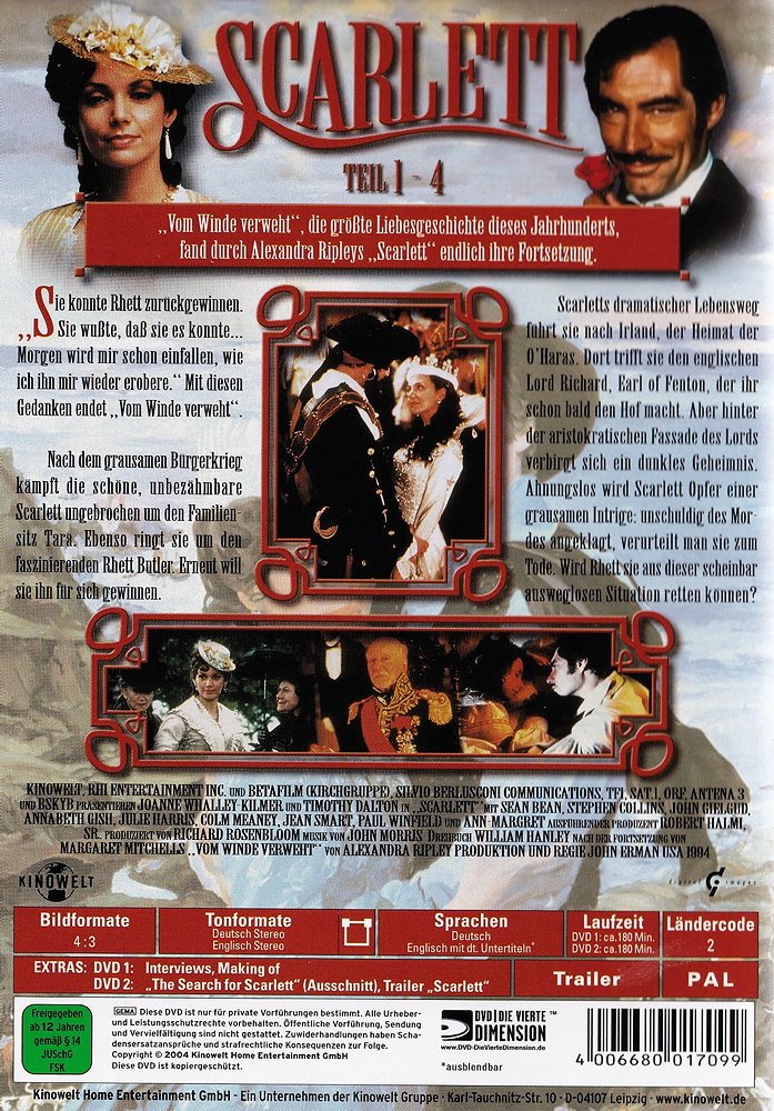 Erleben Sie wie Joanne Whalley-Kilmer die schöne, unbezähmbare Scarlett und Timothy Dalton den faszinierenden Rhett Butler wieder auferstehen lassen. Nach dem grausamen Bürgerkrieg ist Scarletts Kampf um Tara ungebrochen und ebenso ihr Ringen, Rhett Butler erneut für sich zu gewinnen. Begleiten Sie Scarlett auf ihrem dramatischen Lebensweg zurück nach Irland, der Heimat der O'Haras, und sehen sie in Teil 2 wie nahe Ausweglosigkeit und Liebe beieinanderstehen.