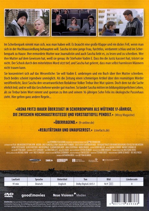 Im Scherbenpark nimmt man sich, was man haben will. Es braucht eine grosse Klappe und ein dickes Fell, wenn harte Sprüche von der Seite kommen oder die eigene Mutter ermordet wird. Sascha ist eine junge Frau, furchtlos, verdammt schlau und im Scherbenpark zu Hause. Ihre Mutter war Journalistin und auch Sascha liebt es zu lesen und zu schreiben. Wer ihre Mutter auf dem Gewissen hat, weiss sie genau: ihr Stiefvater Vadim E. Dass ihn die Justiz kassiert hat, tröstet sie nicht. Sascha und ihre beiden jüngeren Geschwister erlitten durch den miterlebten Mord einen Schock, und Sascha hat gelernt, dass man selbst harmlosen Männern nicht trauen kann.
