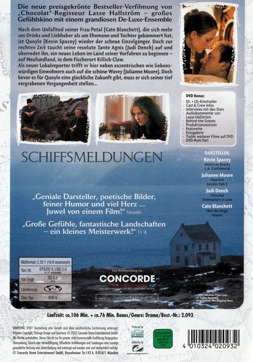 Nach dem Unfalltod seiner Frau Petal, die sich schon immer mehr um Drinks und ihre Liebhaber, als um Ehemann und Tochter Bunny gekümmert hat, ist Quoyle wieder der scheue Einzelgänger, der überall unbeachtet bleibt. Zu tief sitzt der Schmerz, nachdem er erfahren musste, dass Petal nicht nur ihn verlassen, sondern auch Bunny an eine Adoptionsagentur verkaufen wollte. Doch da taucht plötzlich seine resolute Tante auf und überredet ihn, ein neues Leben im Land seiner Vorfahren zu beginnen - auf Neufundland vor der Küste Kanadas. In dem winzigen Fischerort Killick-Claw findet Quoyle zunehmend zu sich selbst und nimmt zum ersten Mal im Leben sein Schicksal selbst in die Hand. Er findet Freunde und aus der Zuneigung zwischen ihm und der Kindergärtnerin Wavey Prowse erwächst langsam eine zarte Liebe. Doch bevor es für die beiden eine gemeinsame Zukunft gibt, müssen er und Wavey sich den Dämonen der Vergangenheit stellen...