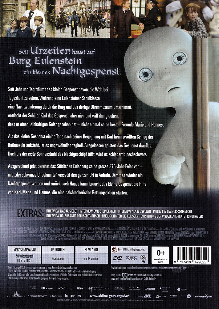 Ausgerechnet jetzt bereitet das Städtchen Eulenberg seine grosse 375-Jahr-Feier vor – und „der schwarze Unbekannte“ versetzt den ganzen Ort in Aufruhr. Damit es wieder ein Nachtgespenst werden und zurück nachhause kann, braucht das kleine Gespenst die Hilfe von Karl, Marie und Hannes, die eine halsbrecherische Rettungsaktion starten