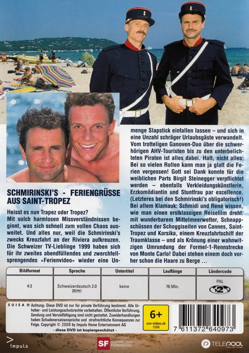 Heisst es nun Trapez oder Tropez? Mit soIch harmIosen Missverständnissen beginnt, was sich schneIl zum voIIen Chaos ausweitet. Und aIles nur, weiI die Schmirinski's zwecks Kreuzfahrt an der Riviera aufkreuzen. Die Schweizer TV-LiebIinge 1999 haben sich für ihr zweites abendfüllendes und zwerchfeIlsprengendes "Ferienvideo" wieder eine Unmenge Slapstick einfaIlen Iassen - und sich in eine Unzahl schräger Urlaubsgäste verwandeIt. Vom trotteIigen Ganoven-Duo über die schwerhörigen AHV-Touristen bis zu den unterbeIichteten Piraten ist alIes dabei. HaIt, nicht alIes: Bei so vielen Rollen kann man ja glatt die Ferien vergessen! Gott sei Dank konnte für die weiblichen Parts Birgit Steinegger verpfIichtet werden - ebenfalls Verkleidungskün stlerin, Erzkomödiantin und Stuntfrau par excelIence. Bei alIem Klamauk: Schmidi und René wissen, wie man einen erstklassigen Reisefilm dreht: mit wunderbarem Mittelmeerwetter, Schnappschüssen der Schoggiseiten von Cannes, Saint-Tropez und Korsika, einem Kreuzfahrtschiff der TraumkIasse - und aIs Krönung einer wahnwitzigen Umrundung der FormeI-1-Rennstrecke von Monte CarIo! Dabei stehen einem doch vorher schon die Haare zu Berge...