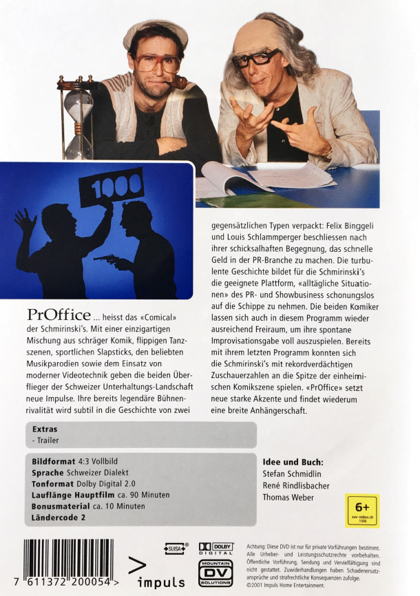 PrOffice...heisst das comical der Schmirinski's. Mit einer einzigartigen Mischung aus schräger Komik, flippegen Tanzszenen, sportlichen Slapsticks, den beliebten Musikparodien sowie dem Einsatz von moderner Videotechnik geben die beiden Überflieger der schweizer Unterhaltungs-Landschaft neue Impulse. Ihre bereits legendäre Bühnenrivaltät wird subtil in die Geschichte von zwei gegensätzlichen Typen verpackt: Felix Binggeli und Louis Schlammperger beschliesssen nach ihrer schicsalhaften Begegnung, das schnelle Geld in der PR-Branche zu machen. Die turbulente Geschichte bildet für die Schmirinski's die geeignete Plattform, alltägliche Situationen des PR-und Showbusinesss schonungslos auf die Schippe zu nehmen. Die beiden Komiker lasssen sich auch in diesem Programm wieder ausreichend Freiraum, um ihre spontane Improvisationsgabe voll auszuspielen. Bereits mit ihrem letzten Programm konnten sich die Schmirinski's mit rekordverdächtigen Zuschauerzahlen an die Spitze der einheimischen Komikszene spielen. "PrOffice" setzt neue starke Akzente und findet wiederum eine breite Anhängerschaft.