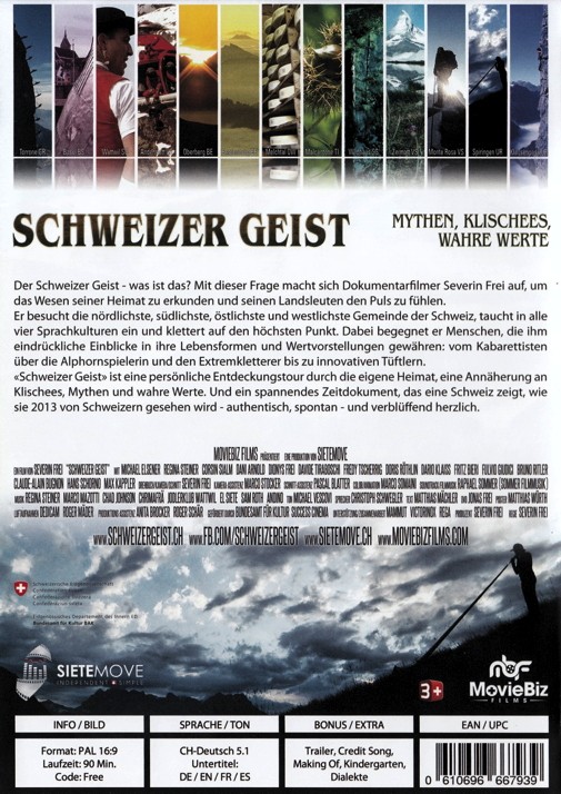 Der Schweizer Geist – was ist das? Mit dieser Frage macht sich Dokumentarfilmer Severin Frei auf, um das Wesen seiner Heimat zu erkunden und seinen Landsleuten den Puls zu fühlen. Er besucht die nördlichste, südlichste, östlichste und westlichste Gemeinde der Schweiz, taucht in alle vier Sprachkulturen ein und klettert auf den höchsten Punkt. Dabei begegnet er Menschen, die ihm eindrückliche Einblicke in ihre Lebensformen und Wertvorstellungen gewähren: vom Kabarettisten über die Alphornspielerin und den Extremkletterer bis zu innovativen Tüftlern. «Schweizer Geist» ist eine persönliche Entdeckungstour durch die eigene Heimat, eine Annäherung an Klischees, Mythen und wahre Werte. Und ein spannendes Zeitdokument, das eine Schweiz zeigt, wie sie 2013 von Schweizern gesehen wird – authentisch, spontan – und verblüffend herzlich.
