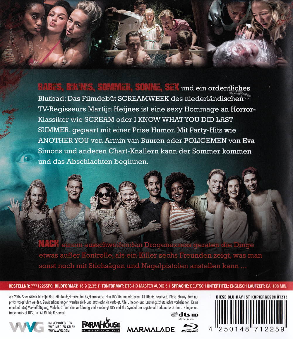 Babes, Bikinis, Sommer, Sonne, Sex und ein ordentliches Blutbad: Das Film-Debut Scream week des niederländischen TV-Regisseurs Martijn Heijnes ist eine sexy Hommage an Horror-Klassiker wie Scream oder I know what you did last summer, gepaart mit einer Prise Humor. Mit Party-Hits wie Another you von Armin van Buuren oder Policemen von Eva Simons und anderen Chart-Knallern kann der Sommer kommen und das Abschlachten beginnen. Nach einem ausschweifenden Drogenexzess geraten die Dinge etwas ausser Kontrolle, als ein Killer sechs Freunden zeigt, was man sonst noch mit Stichsägen und Nagelpistolen anstellen kann...