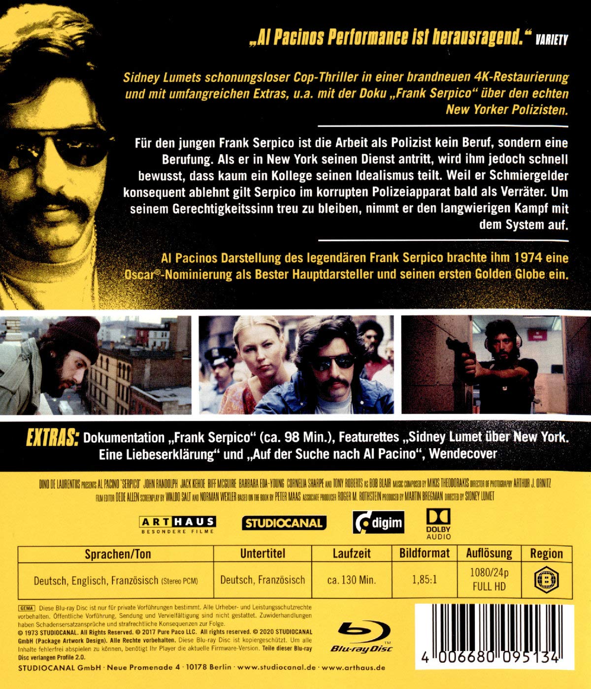 Für den jungen Serpico ist die Arbeit als Polizist kein Beruf, sondern eine Berufung. Als er in New York seinen Dienst antritt, wird ihm jedoch schnell bewusst, dass kaum ein Kollege seinen Idealismus teilt. Weil er Schmiergelder konsequent ablehnt, gilt Serpico im korrupten Polizeiapparat bald als Verräter. Um seinem Gerechtigkeitssinn treu zu bleiben, nimmt er den langwierigen Kampf mit dem System auf. Der auf wahren Begebenheiten beruhende Cop-Thriller erscheint in einer brandneuen 4K Restaurierung und mit umfangreichen Extras.