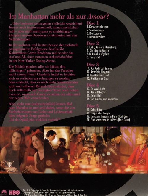 In der sechsten und letzten Staffel der mehrfach preisgekrönten Erfolgsserie beschreibt Kolumnistin Carrie Bradshow mal wieder das Auf und Ab einer extremen Achterbahnfahrt in der New Yorker Dating-Szene.