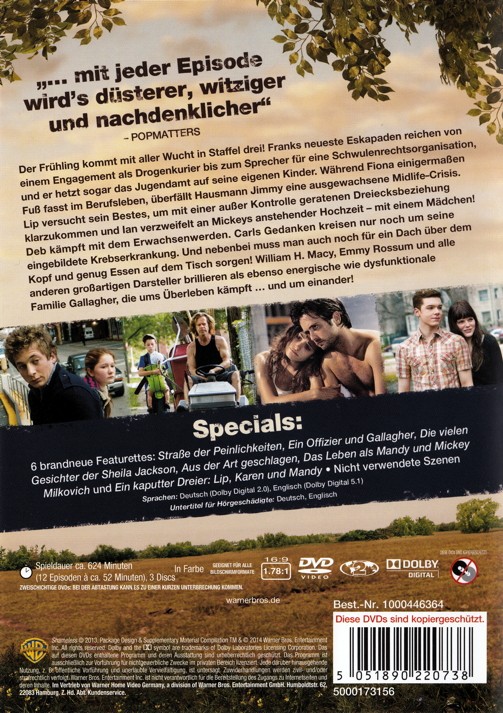 Der Frühling kommt mit aller Wucht in Staffel drei! Franks neueste Eskapaden reichen von einem Engagement als Drogenkurier bis zum Sprecher für eine Schwulenrechtsorganisation, und er hetzt sogar das Jugendamt auf seine eigenen Kinder. Während Fiona einigermaßen Fuß im Berufsleben fasst, überfällt Hausmann Jimmy eine ausgewachsene Midlife Crisis. Lip versucht sein bestes, mit einer außer Kontrolle geratenen Dreiecksbeziehung klar zu kommen und Ian verzweifelt an Mickeys anstehender Hochzeit mit einem Mädchen! Deb kämpft mit dem Erwachsenwerden. Carls Gedanken kreisen nur noch um seine eingebildete Krebserkrankung. Und nebenbei muss man auch noch für ein Dach über den Kopf und genug Essen auf dem Tisch sorgen! William H. Macy, Emmy Rossum und alle anderen großartigen Darsteller brillieren als ebenso energische wie dysfunktionale Familie Gallagher, die ums Überleben kämpft und um einander!